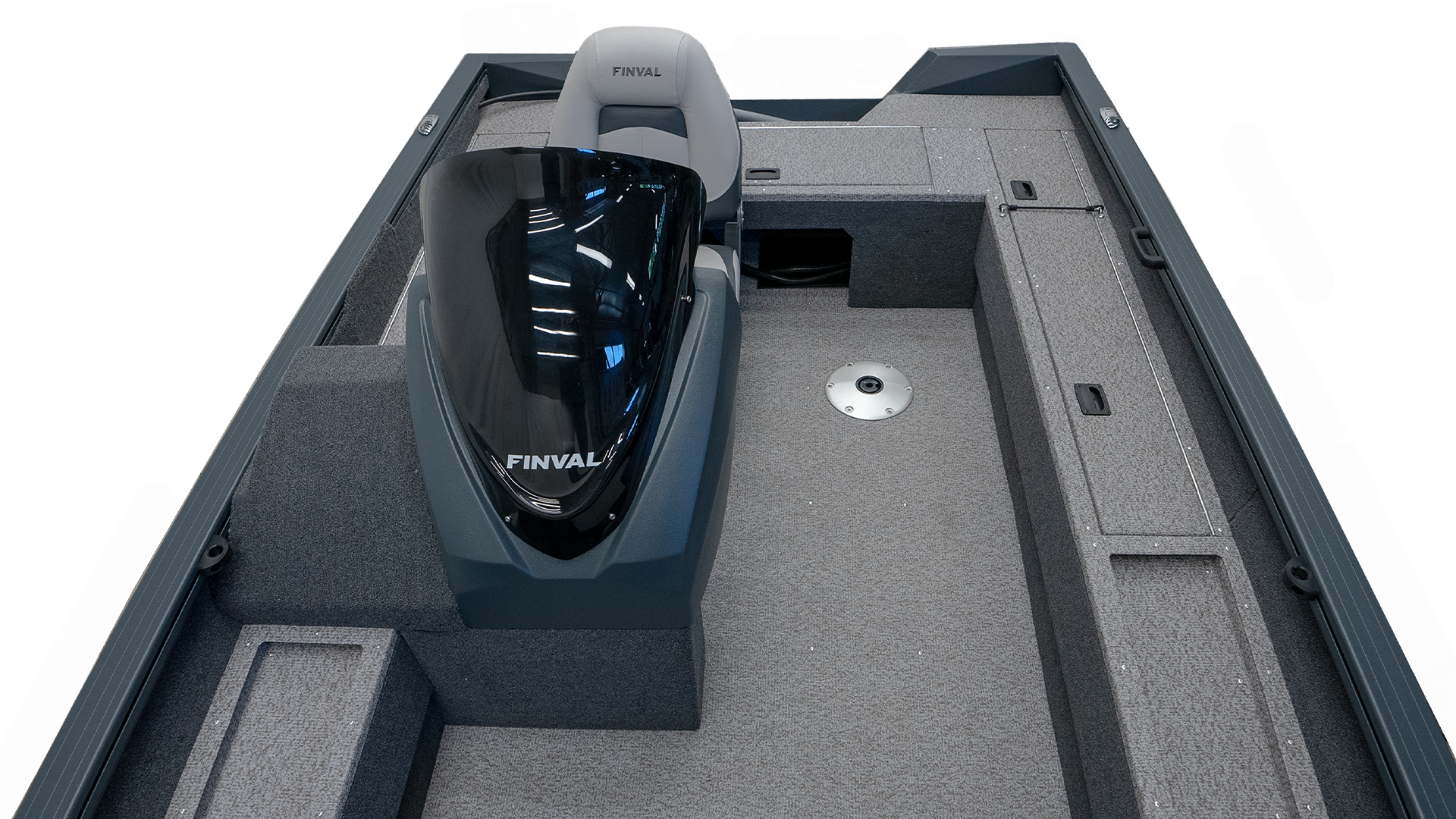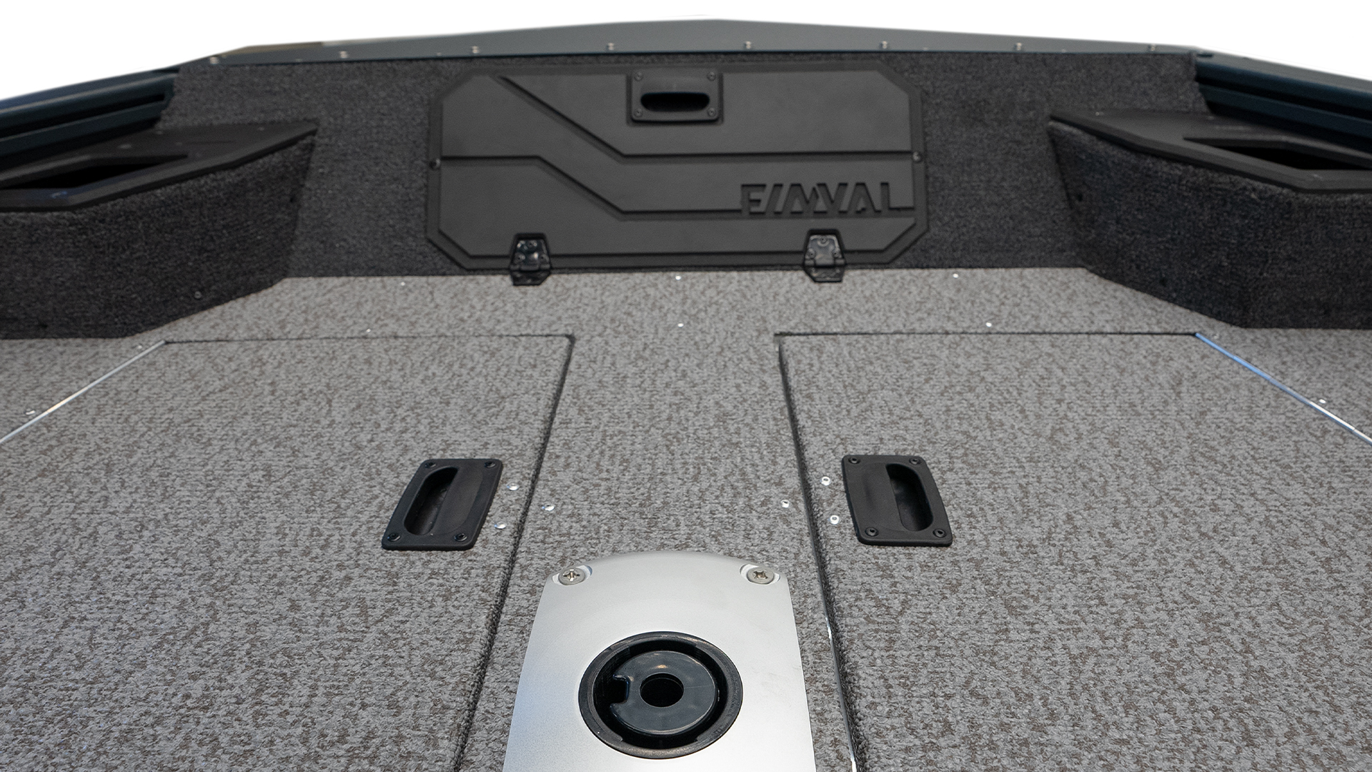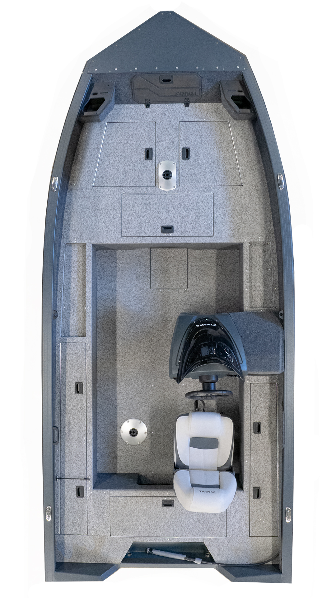 „FINVAL“ LOGO ON THE LOCKER IN THE BOW DECK; GREY/BLACK/SILVER BRANDED „X“ STICKERS, AND LOGO „FINVAL“