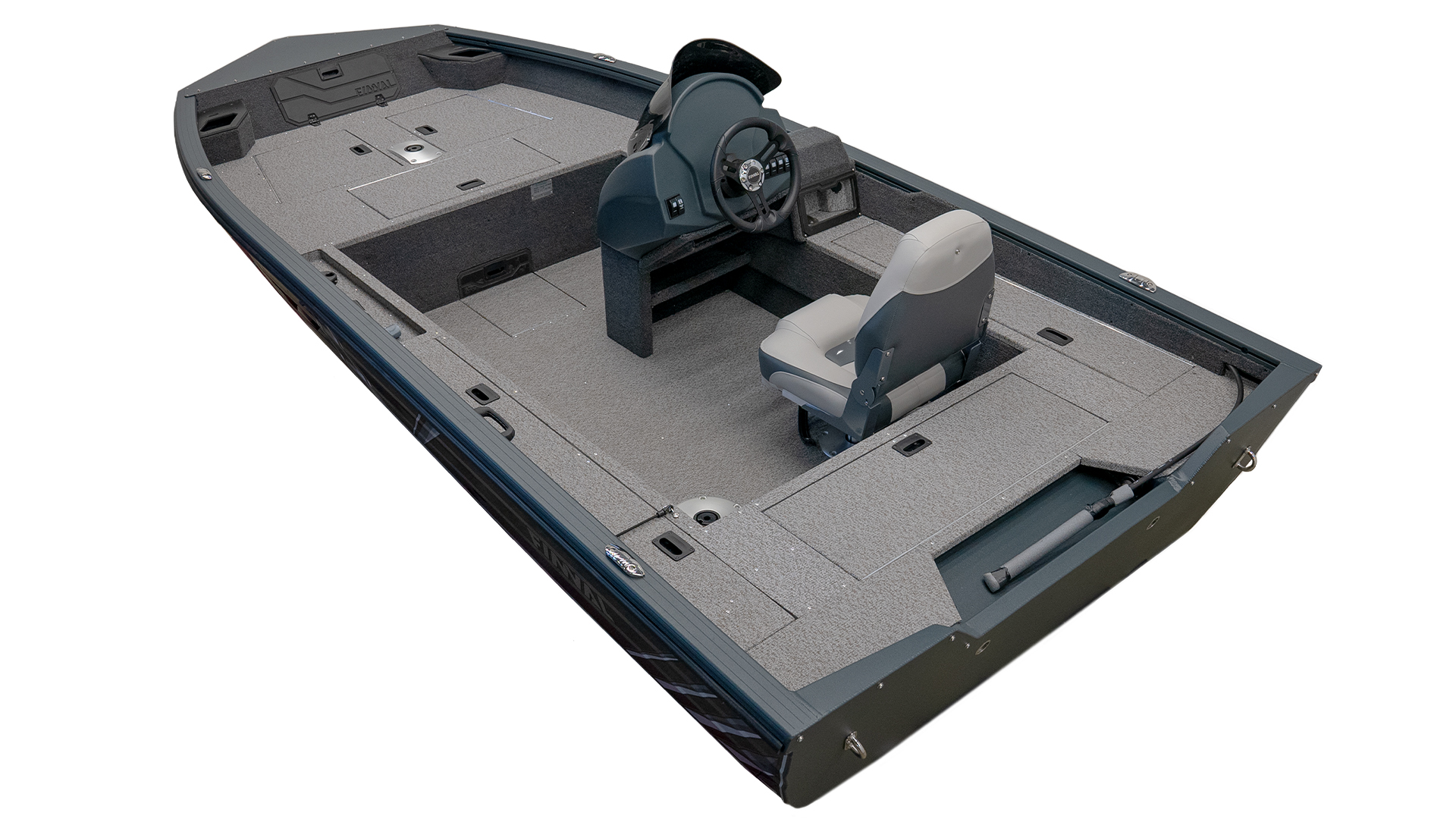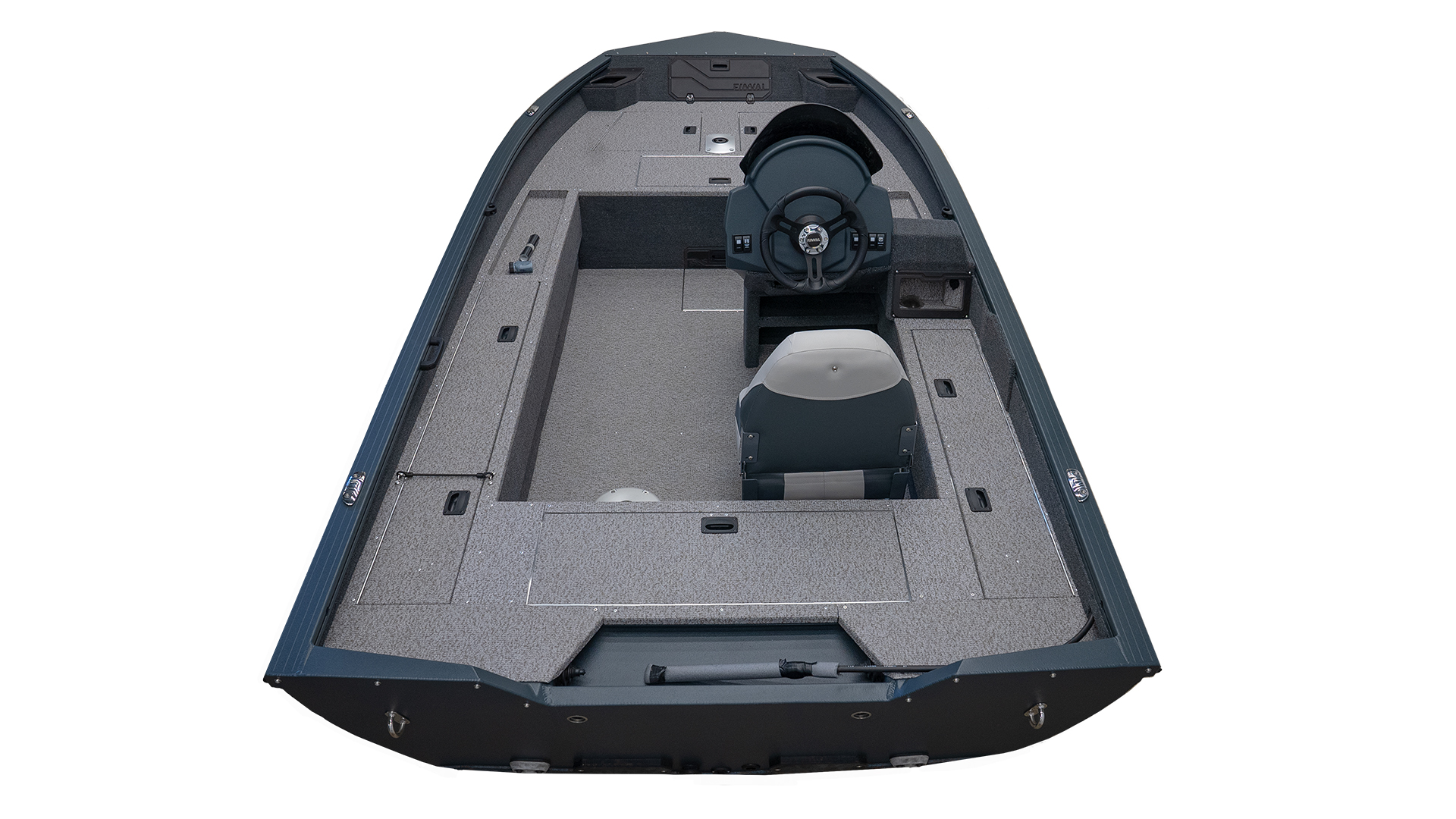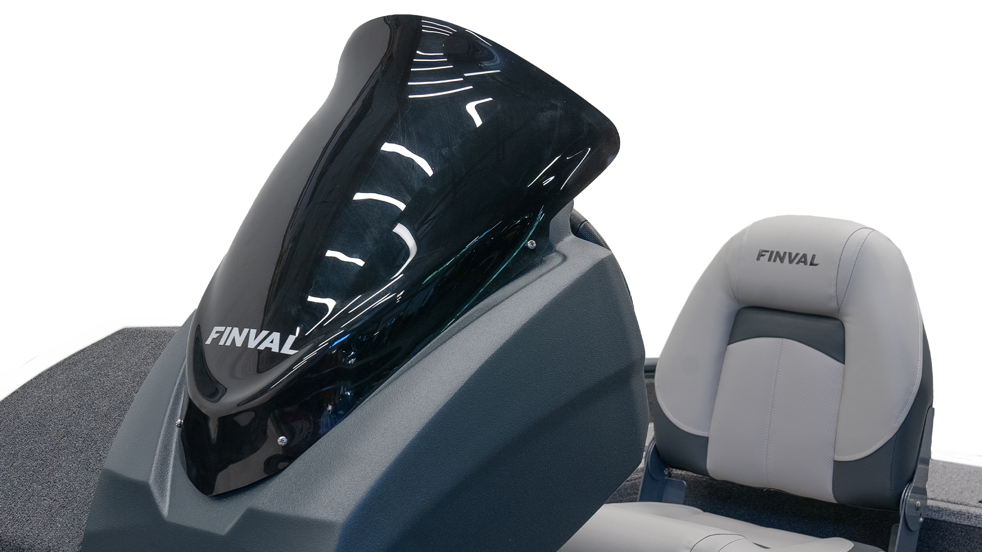 „FINVAL“ LOGO ON THE LOCKER IN THE BOW DECK; GREY/BLACK/SILVER BRANDED „X“ STICKERS, AND LOGO „FINVAL“